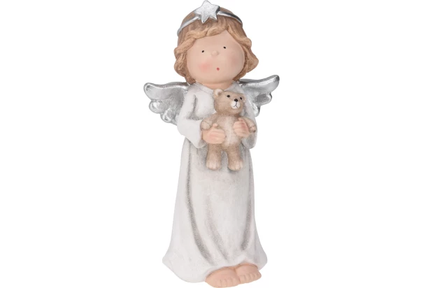 Okouzlující soška anděla, vyrobená z kvalitního magnesia, přináší do vašeho domova příjemnou sváteční atmosféru. Povrchová úprava ve stříbrné barvě dodává andělu nádech luxusu a jemnosti, což se skvěle hodí k tradičním i moderním vánočním dekoracím. Anděl je dostupný ve dvou variantách – s roztomilým medvídkem, který symbolizuje něžnost a radost, nebo bez medvěda, což umožňuje univerzální využití v různých dekorativních stylech. S výškou 41 cm je figurka ideální pro umístění na poličku, komodu nebo vánoční stůl, kde může být dominantním prvkem vaší sváteční výzdoby.