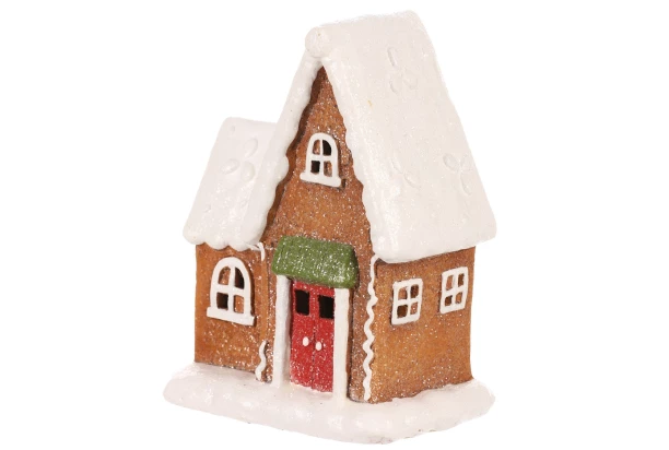 Sváteční dekorace z hnědé keramiky dokonale připomíná skutečný perníkový domek díky detailnímu zdobení a věrohodnému vzhledu. Má bílá okénka a další ozdobné prvky, kromě dvířek, která jsou červená a zelené stříšky nad nimi. Samotný domeček se zasněženou střechou stojící na bílém podkladu, jen potrhuje krásu zimního období. LED osvětlení napájené dvěma bateriemi LR44 navodí útulnou sváteční atmosféru během zimních večerů.