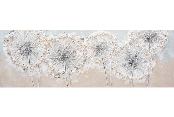 Ručně malovaný obraz olejem s motivem odkvetlých pampelišek zaujme svou krásou, bohatými detaily, plastičností a originalitou. Každý obraz je jedinečný díky ručnímu zpracování umělce, který projevuje svou kreativitu a citlivost ve všech krocích malování. Olejomalba o rozměru 120×40 cm se může stát centrálním bodem místnosti nad gaučem, dokáže navodit útulné prostředí v ložnici, na stěně v jídelně nebo na chodbě umí přitáhnout pozornost návštěv a vytvořit příjemnou atmosféru. Nástěnná dekorace se snadno přizpůsobí různým stylům bydlení, kde bude vypadat skutečně působivě.