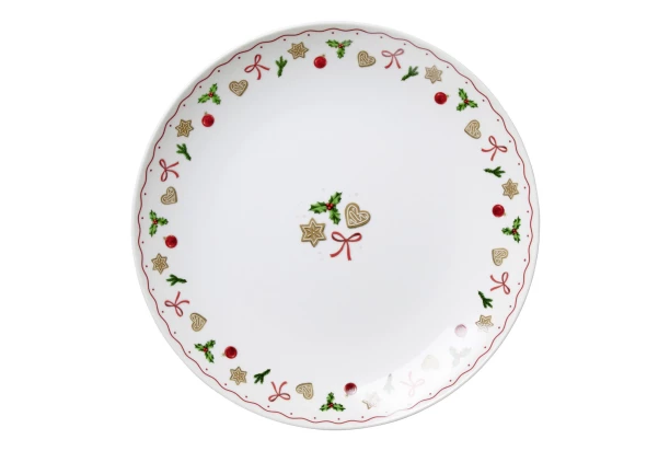 Tento elegantní a svátečně laděný talíř je ideální na vánoční cukroví. Je vyroben z kvalitního porcelánu a zdobí ho nádherné vánoční motivy, jako jsou perníčky, mašle, ozdoby a další symboly Vánoc. Průměr 23,5 cm.