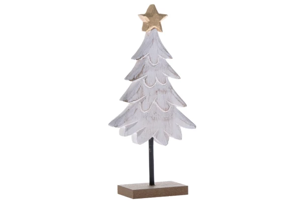 Dřevěný vánoční stromeček s bílým nátěrem a zlatou hvězdou na vrcholu vyniká svým jednoduchým, přesto elegantním designem, který se hodí do každého interiéru. Světlé dřevo a jemné detaily v neutrálních barvách umožňují snadné sladění s ostatními vánočními ozdobami, což z něj dělá ideální dekoraci pro vytvoření útulné atmosféry. Výška 18,5 cm.