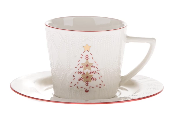 Tato elegantní sada hrnečku s podšálkem, zdobená jednoduchým motivem vánočního stromečku, je dokonalým dárkem pro vaše blízké a skvělým doplňkem k navození sváteční nálady. V šálku s objemem 110 ml si vychutnáte svou oblíbenou kávu či horkou čokoládu a necháte se unést kouzlem vánoční atmosféry.