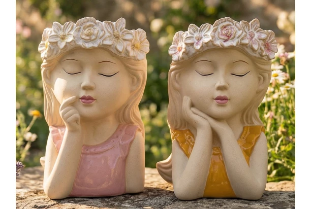 Dekorativní květináč dodáván ve 2 různých designech snící dívky s květinovou čelenkou vnese do vašeho domova nebo zahrady nádech něhy a klidu. Kameninový obal na květiny okamžitě upoutá pozornost a stane se nejen praktickým doplňkem, ale i stylovou dekorací.