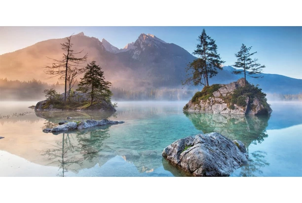Obraz tištěný na plátně o rozměru 100×50 cm s motivem horské krajiny vnese do interiéru atmosféru klidu a harmonie. Tento obraz zachycuje pohled na bavorské jezero Hintersee v ranních paprscích.