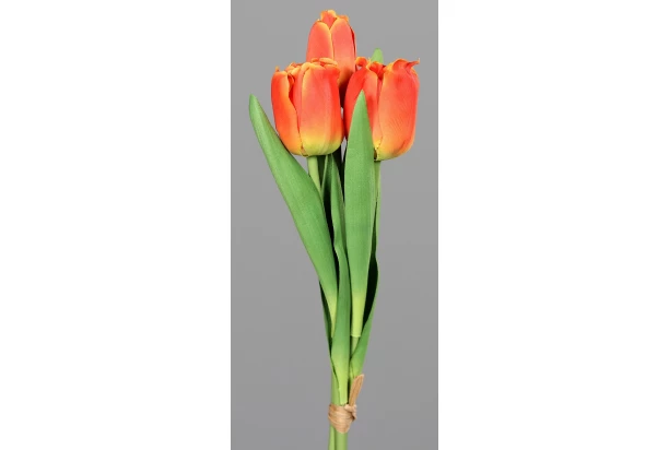 Krásný umělý svazek tří oranžových tulipánů je ideální jako dekorace pro váš domov. Každý tulipán je vyroben z plastu, který věrně napodobuje živou květinu. Elegantní svazek o délce 30 cm je vhodný pro aranžování v různých typech váz. Díky své realistické podobě tato umělá kytka vnese do vašeho prostoru příjemnou jarní atmosféru bez nutnosti péče.