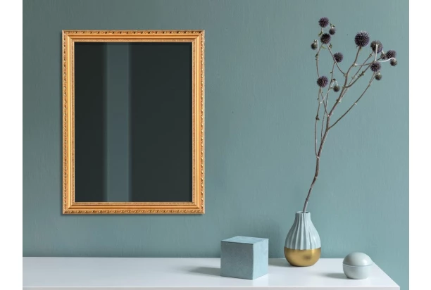 Elegantní nástěnné zrcadlo s dřevěným rámem ve zlaté barvě je dekorativním i praktickým doplňkem každého interiéru. Snadno zapadne do předsíně, ložnice, obývacího pokoje i koupelny. Kompaktní rozměr 34×45 cm je ideální do menších místností, které opticky zvětší a rozjasní.