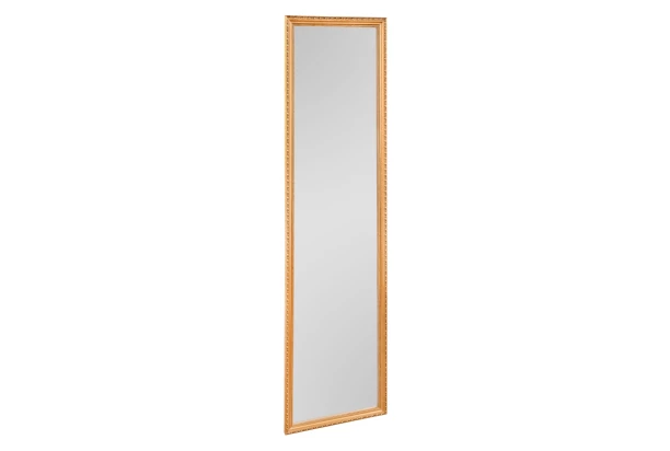 Elegantní nástěnné zrcadlo s dřevěným rámem ve zlaté barvě je dekorativním i praktickým doplňkem každého interiéru. Snadno zapadne do předsíně, ložnice i obývacího pokoje. Rozměr 35×125 cm.
