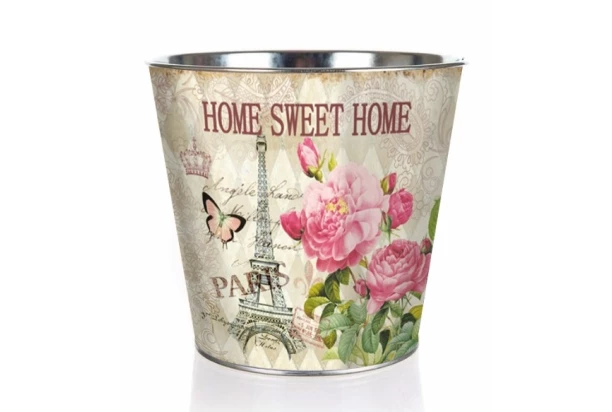 Okouzlující plechový květináč 12 × 11,5 cm přinese do vašeho domova kousek pařížského šarmu. S romantickým motivem „Home Sweet Home Paris“, který kombinuje Eiffelovu věž, něžné růže a motýly, se stane elegantní dominantou každého interiéru. Jeho vintage styl s jemným nádechem francouzského shabby chic vytvoří útulnou a harmonickou atmosféru. Květináč není jen stylovým doplňkem – je i praktickým pomocníkem, který se hodí na bylinky, pokojové rostliny nebo jako originální obal na dekorace.