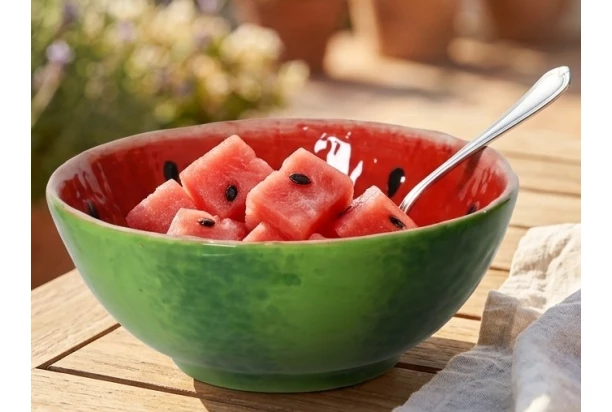 Stylová miska s melounovým motivem je praktickým i designovým doplňkem do kuchyně i na zahradu. Díky svému hravému vzhledu okamžitě rozzáří každé stolování, od rychlé snídaně až po letní grilování s přáteli. Průměr 15 cm.