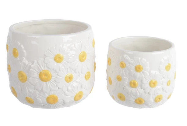 Sada 2 květináčů s jemným motivem květů heřmánku či kopretin vnese do vašeho domova jarní atmosféru. Obaly na květináč jsou ručně vyrobené z dolomitu a díky rozdílné výšce působí při aranžování přirozeně a harmonicky.