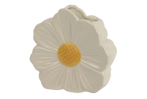 Designová váza ve tvaru rozkvetlého heřmánku či kopretiny je vyrobena z hladkého dolomitu v jemné bílé barvě se žlutým středem. Díky svému originálnímu tvaru se stane výrazným doplňkem interiéru. Skvěle vynikne na komodě, stole či parapetu a dodá prostoru svěží jarní atmosféru. Ideální jako dekorace, ale také nabízí praktické využití pro drobné květiny. Výška 14,8 cm.
