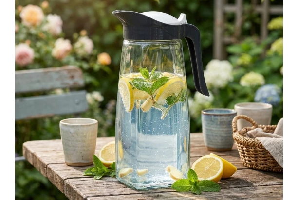 Skleněná konvice s plastovým víkem v šedé nebo bílé barvě je praktický pomocník pro každodenní stolování i zahradní oslavy. Džbán o objemu 1,5 l je vhodný na vodu, čaj, limonády a další nápoje.