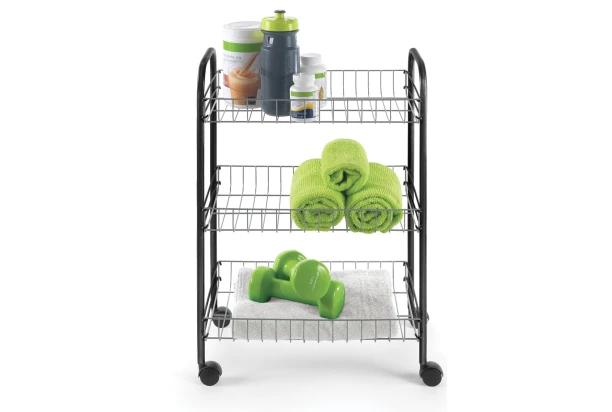 Univerzální pojízdný regál se 3 košíky je praktickým řešením pro rozšíření úložného prostoru nejen v kuchyni. Víceúčelový vozík na kolečkách lze využít jako servírovací stolek, ale také nabízí dostatek místa pro koupelnové potřeby, čistící prostředky nebo kancelářské doplňky. Povrchová úprava kovová šedá/černá.