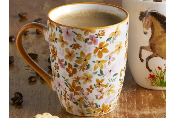 Hrnek o objemu 340 ml s akvarelovou ilustrací květin je ideální pro každodenní pití kávy či čaje.