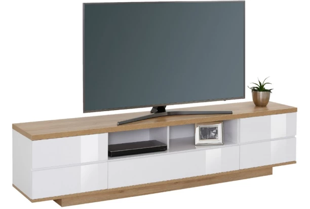 Široká TV skříňka v moderním designu působí vzdušně díky dolnímu soklu. Vyniká nejen svou 200 cm šířkou, ale i kvalitním zpracováním. Vyrobena v kombinaci dubu riviera a bílého lesku.