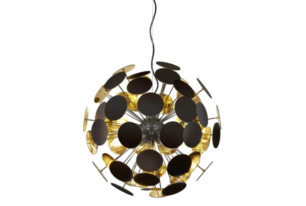 Nevšední a extravagantní stropní lustr se stane opravdovým poutačem, který vykouzlí v místnosti krásné světelné efekty. Kulaté plastové černo-zlaté disky, které jsou na svítidle uspořádány pomocí tenkých tyčí, z lampy dělají jedinečný dekorativní bytový doplněk. Průměr 54 cm.