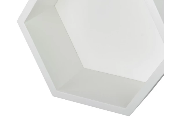 Moderní nástěnná polička v bílé barvě ve tvaru hexagonu pro uložení drobností nebo dekorací. Na zdi skvěle vynikne. Použitím více kusů vytvoříte zajímavější efekt.