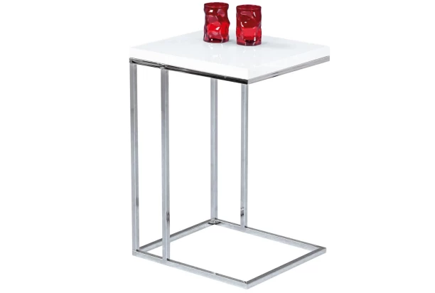 Lesklý bílý stolek s horní odkládací policí prakticky doplní moderní interier. Stabilní kovová podnož v leskle chromovém provedení tak bude ladit s vašimi bytovými doplňky a dekoracemi. Stolek využijete pro odkládání kávy, na časopisy, pro umístění novin nebo jen tak na bytové dekorace, které dodávají na útulnosti vaší domácnosti. Vhodný do obýváku, chodby i třeba ložnice k posteli.