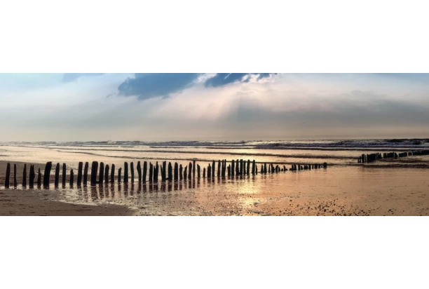 Trendovní obraz na zeď o rozměru 150×50 cm zobrazuje romantickou přírodní scenérii oblohy a mořské pláže s dřevěnými kůly. Tyto oblíbené motivy jsou nikdy nekončícím trendem v našich domácnostech.
