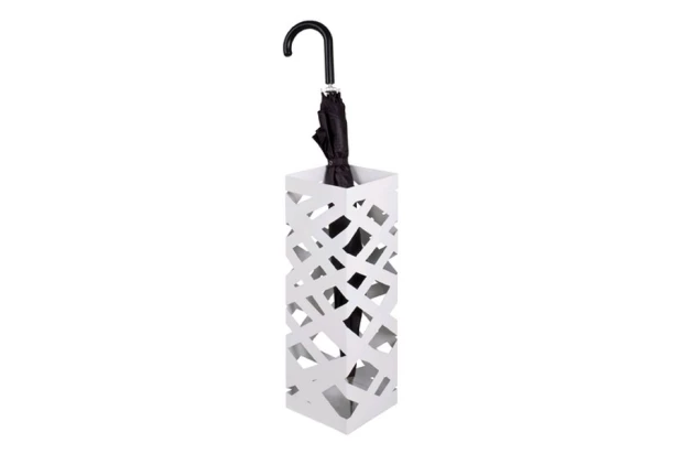 Bílý kovový stojan na deštníky v zajímavém designu je praktickým doplňkem do každého moderního interieru.
