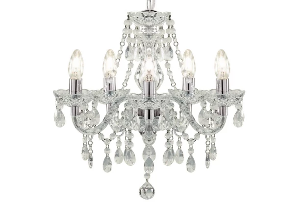 Lustr z imitace křišťálu je stále módním doplňkem interieru. V čirém provedení.