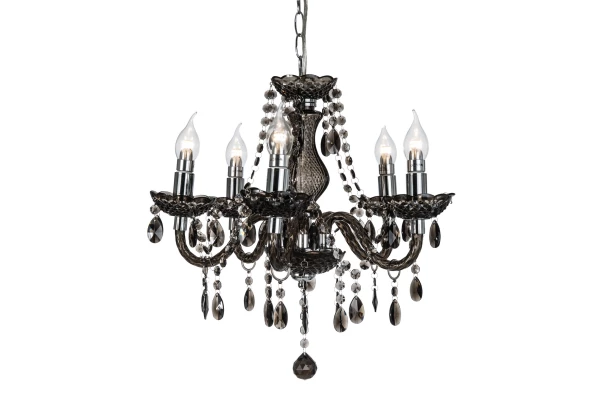 Lustr z imitace křišťálu je stále módním doplňkem interieru. V kouřově černém provedení.