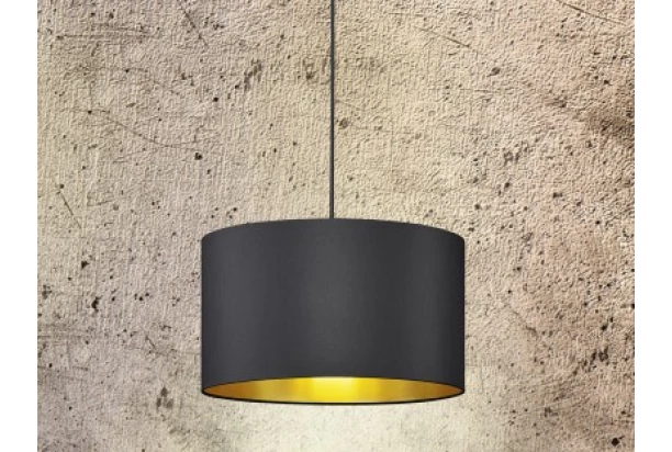 Lustr laděný do industriálního stylu s černým stínidlem, které je z vnitřní strany ošetřeno zlatým nátěrem.