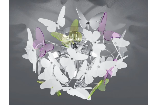 Atraktivní stropní osvětlení se stínidlem tvořeným barevnými motýly je zároveň hravým a originálním doplňkem v mladistvě zařízeném interiéru.
