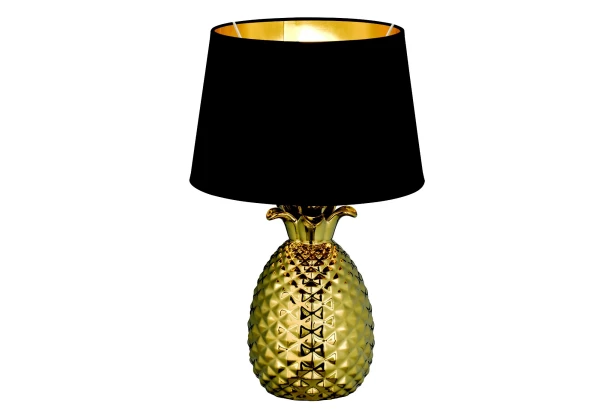 Stylová neobvyklá stolní lampa s jednoduchým textilním stínidlem a podstavcem v trendy ananasovém designu je přes den krásným dekorativním prvkem a večer příjemným osvětlením. Stolní lampička o výšce 43 cm skvěle doplní polici, komodu nebo malý stolek. Zlatý podstavec dokonale ladí s černým stínidlem, které je uvnitř také zlaté.