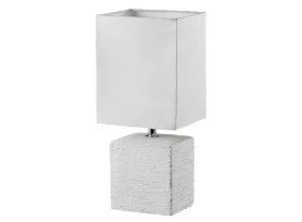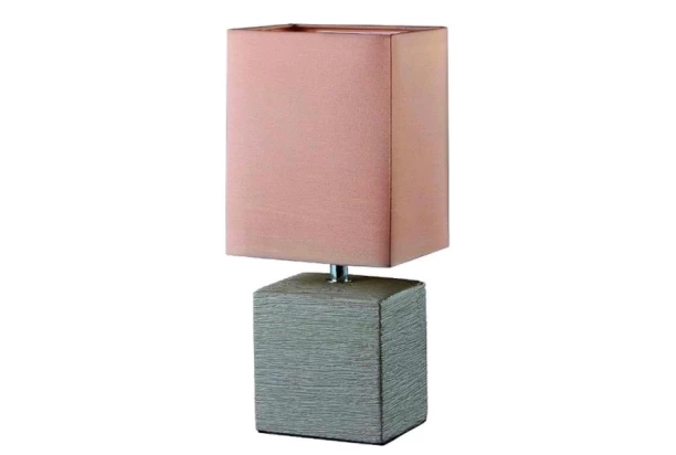 Stolní lampa má zajímavě strukturovanou konstrukci a stínidlo kombinované látkou v odstínu taupe.