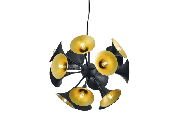 Nevšední a extravagantní závěsný lustr se stane opravdovým poutačem, který vykouzlí v místnosti krásné světelné efekty. Svítidlo se skládá z 15 kovových stínidel ve tvaru trubky, která jsou seskupena do tvaru koule. Kombinace černé a zlaté barvy dodává lampě moderní vzhled.
