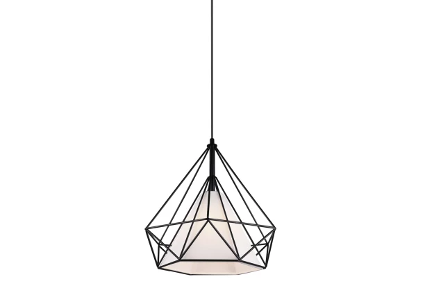 Závěsný stropní lustr s dekorativní kovovou mřížkou a vnitřním trychtýřovitým stínidlem z bílé látky je moderní atraktivní bytový doplněk. Pozornost upoutá v obývacím pokoji, na chodbě nebo nad jídelním stolem v kuchyni či jídelně.