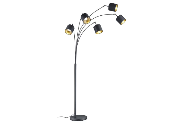 Stojací lampa ze série Tommy v jednoduchém, ale moderním stylu, vykouzlí v každé domácnosti útulnou atmosféru. Lampa je vyrobena z kovu v provedení černý mat a je doplněna pěti svítidly s černo-zlatými textilními stínidly, která jsou polohovatelná. Ideálně se hodí pro umístění vedle sedačky nebo křesla.