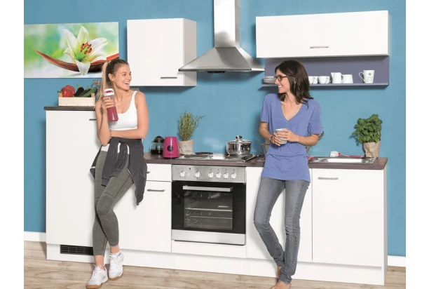 Moderní kuchyňský blok o celkové šířce 270 cm je vyroben v bílé barvě. Jednotlivé skříňky můžete mezi sebou kombinovat a přizpůsobit si tak kuchyni podle svých potřeb. Včetně pracovní desky v zajímavé vintage optice šedého dřeva.
