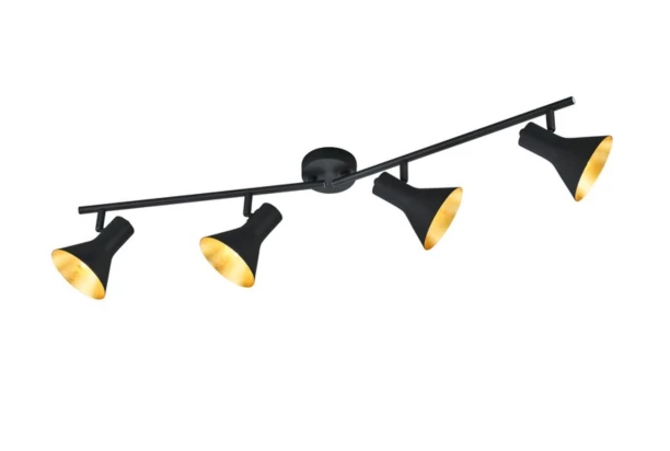 Stropní lampa laděná do industriálního stylu má čtyři černá kovová stínidla, která jsou z vnitřní strany ošetřena zlatým nátěrem se záměrnými stopami po šrámech a obroušení.