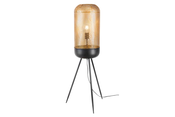 Stojací lampa Fargo o výšce 110 cm zaujme moderním a nadčasovým designem. Svítidlo s černou kovovou konstrukcí a drátěným stínidlem ve zlatém provedení vynikne v každém stylově zařízeném interieru.
