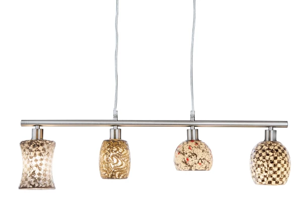 Stylové závěsné stropní osvětlení s kovovou konstrukcí a se stínidly z vícebarevného mozaikového jemného skla perfektně zapadne do obývacího pokoje, ložnice nebo jídelny. Varianta se 4 svítidly.