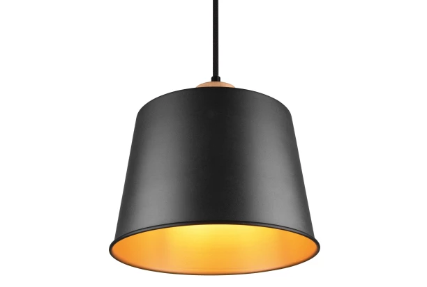 Závěsný stropní lustr v trendy materiálové kombinaci kovu a přírodního dřeva působí moderně a krásně vynikne nad jídelním stolem, kde vytvoří příjemnou světelnou atmosféru. Světlé dřevo dokonale ladí s černými a zlatými odstíny kovového stínidla o průměru 26 cm.