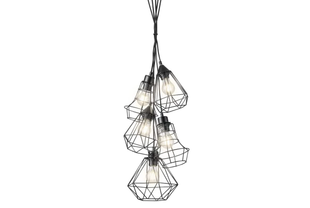 Závěsné osvětlení s 5 dekorativními drátěnými stínidly v různých tvarech vykouzlí v každé místnosti zajímavé stíny. Designový lustr v matně černém provedení se dokonale přizpůsobí k mnoha stylům nábytku a skvěle zapadne do moderně, industriálně nebo vintage zařízeného interiéru.