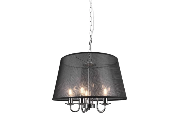 Elegantní lustr s chromovou konstrukcí a se stínidlem z třpytivé organzové látky v černé barvě působí moderně a vkusně. Příjemné osvětlení oceníte v obývacím pokoji nebo jídelně. Průměr 50 cm.
