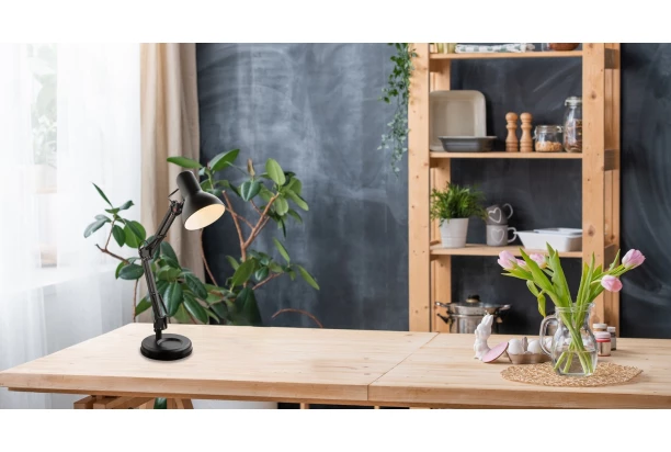 Moderní lampa k psacímu stolu v černém provedení má tři pružné klouby, díky kterým lze světlo optimálně nasměrovat a zajistit tak dobrou pracovní atmosféru. Lampička poskytuje jasné světlo v dětském pokoji, ale hodí se i jako lampa na čtení v obývacím pokoji nebo ložnici.