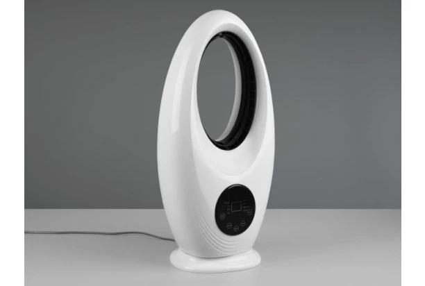 Krásný stolní ventilátor v bílé barvě má moderní design a je vybaven LED světelným zdrojem. Tento stojací ventilátor lze dobře umístit do jakéhokoli interiéru a také snadno přemístit na jiné místo. K dispozici jsou tři úrovně rychlosti, které lze nastavit a ovládat pomocí dodávaného dálkového ovladače. Větrák má integrovanou funkci oscilace, která způsobuje, že se automaticky otáčí z jedné strany na druhou, čímž poskytuje širší rozsah proudění vzduchu. Umožňuje také nastavit tři barvy světla červenou, zelenou a modrou (RGB). Ventilátor lze ovládat pomocí dotykové obrazovky.