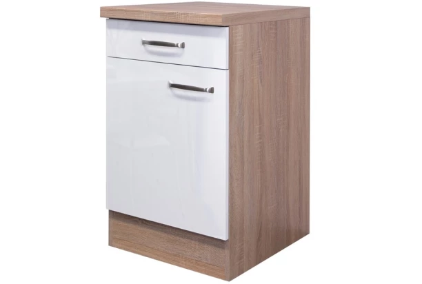 Dolní kuchyňská skříňka o šířce 50 cm z elegantního kuchyňského programu Valero – útulnou kombinaci dekoru dub sonoma a bílé barvy ve vysokém lesku doplňuje zaoblený kovový úchyt v nerezovém provedení. Elementy kuchyňského programu Valero můžete mezi sebou libovolně kombinovat a sestavit si tak kuchyni podle vašich individuálních potřeb a prostorových možností.