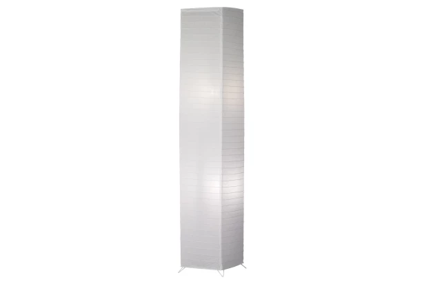 Stojací lampa s bílým papírovým stínidlem a kovovou základnou poskytne příjemné světlo v každém obývacím pokoji. Celková výška 130 cm.