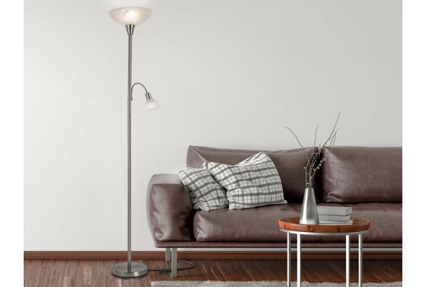 Stojací LED lampa o výšce 180 cm s boční lampičkou na čtení je vyrobena z kovu v provedení matný nikl a její stínidla jsou z alabastrového běleného skla. Boční rameno lze snadno polohovat a nasměrovat si tak světlo podle potřeby.