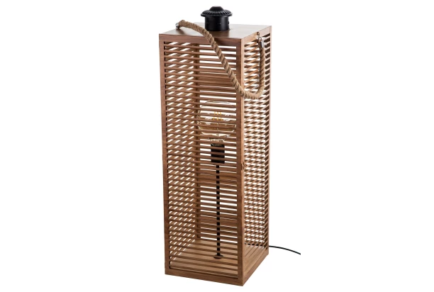 Stojací lampa v optice lucerny v přirozeném designu se stane jedinečným poutačem ve Vašem obývacím pokoji nebo kdekoliv jinde. Lampa o výšce 80 cm je vyrobena převážně z kovu a je lakována ve vzhledu dřeva, což jí dodává přírodní kouzlo. Světlo proniká skrz mezery v těle lucerny, díky kterým se v okolí vytváří efektní pruhovité stíny. Svítidlo lze použít jako dekorativní prvek nebo jako zdroj světla, který vykouzlí v místnosti příjemnou světelnou atmosféru.
