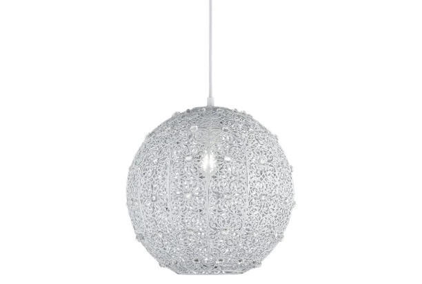 Mimořádně dekorativní lustr o průměru 32 cm dozdobí Váš domov. Stínidlo v jednoduchém barevném bílém provedení s jemným vzorem podtrhuje eleganci svítidla, největší pozornost však upoutá svými krystalky. Díky hravému designu lampa zaujme i během dne, zatímco po rozsvícení poskytne zajímavé světlo v obývacím pokoji nebo ložnici.