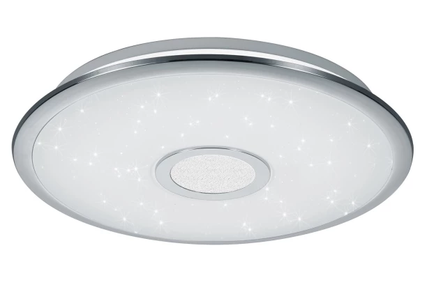Jedinečné LED stropní nebo také nástěnné osvětlení v atraktivním designu se stane opravdovým poutačem v obývacím pokoji, ložnici nebo třeba na chodbě. Zaujme svým brilantním hvězdným efektem, integrovaným stmívačem, měničem barev a funkcí noční světlo. Všechny funkce lze pohodlně ovládat pomocí přiloženého dálkového ovladače. Moderní stropní lampa o průměru 42 cm v kombinaci lesklého chromu a bílého stínidla snadno zapadne do každého interiéru.