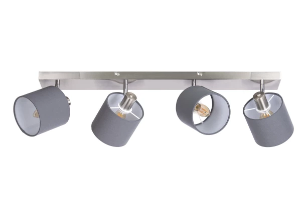 Stropní osvětlení se 4 svítidly je praktickým i dekorativním bytovým doplňkem. Kovová konstrukce v provedení matný nikl dokonale ladí s látkovými stínidly v šedé barvě o průměru 12 cm. Lampa poskytne příjemné světlo u Vás doma.