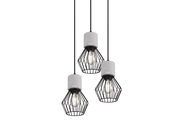 Závěsné stropní osvětlení se 3 dekorativními drátěnými stínidly vykouzlí v každé místnosti zajímavé stíny a útulnou atmosféru. Trendy barevná kombinace černá matná a vzhled šedého betonu společně dokonale ladí a zajišťuje tak svítidlu jednoduchou eleganci.